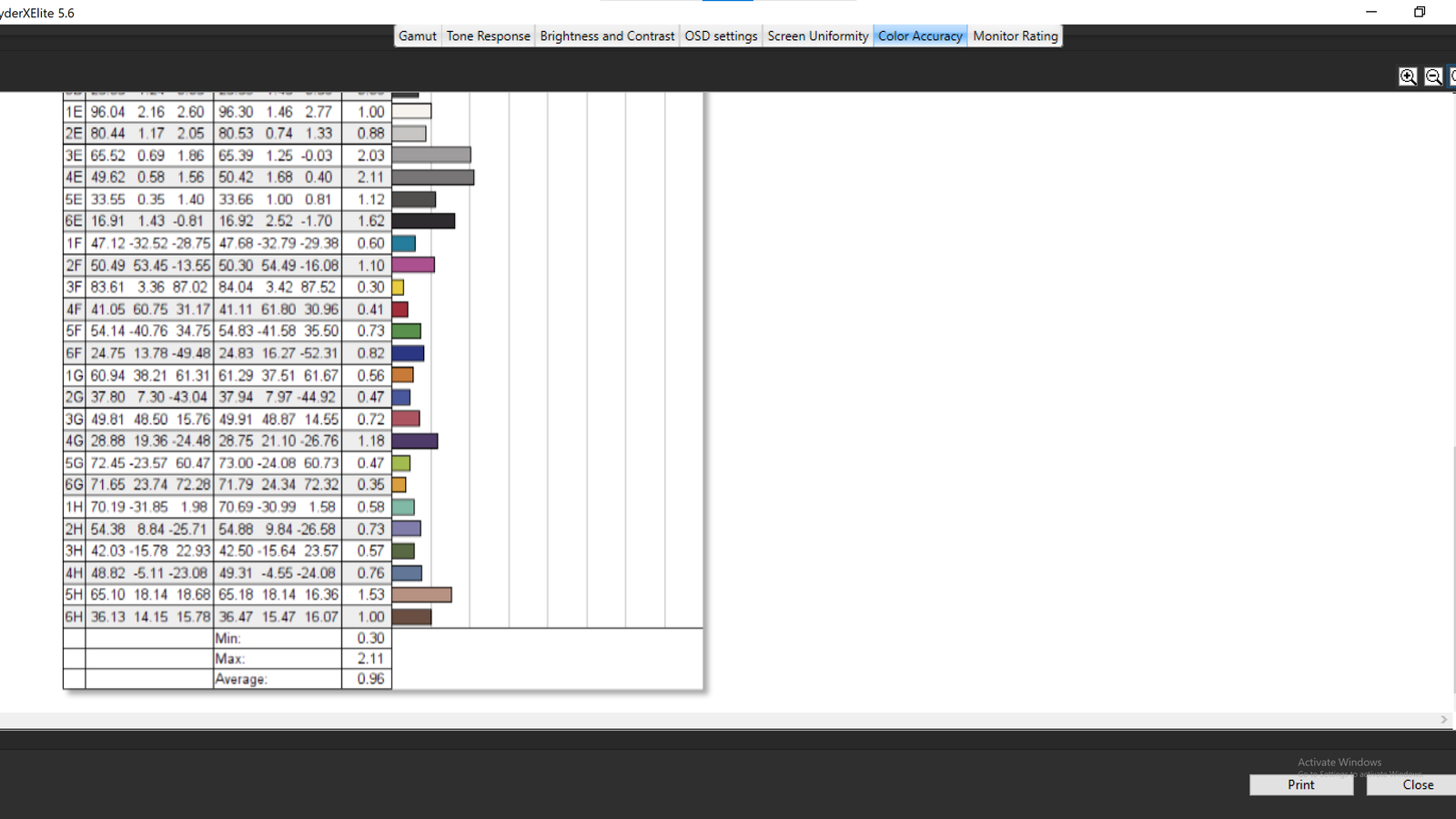 Với việc sử dụng tấm nền OLED, màn hình của ASUS Vivobook 15X OLED coi như đã được bảo đảm về độ sâu màu và chuẩn màu. Cụ thể thì khi sử dụng công cụ SpyderX Elite để đo đạc, chúng ta sẽ có được những con số ấn tượng như độ phủ 100% sRGB, 97% AdobeRGB, 99% DCI-P3 cùng độ lệch màu DeltaE cực kỳ thấp với chỉ 0.49.